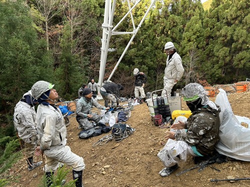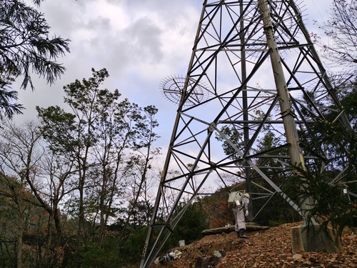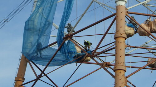 | 15:00 作業終了 | 後はみんなで後片付け。 地上作業員は、鉄塔から降りてくる荷物を手際よくさばけるか腕の見せ所。 あと一息でもご安全に! |