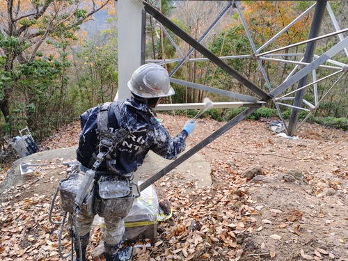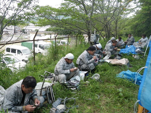 | 12:00 昼休み | 午前中の作業終了。 日によって作業内容は変わるけれど、 午前中は主に準備と塗装作業を行います。 鉄塔敷地内でお昼休憩。 |