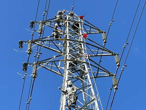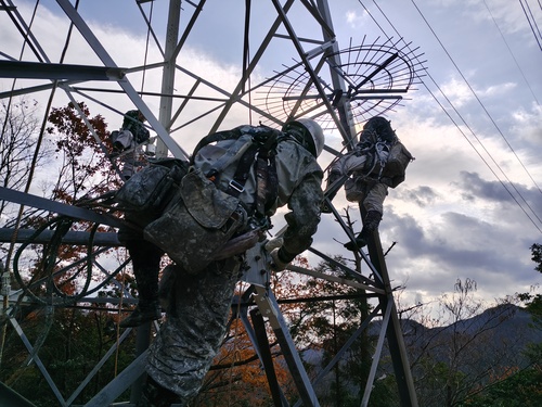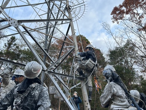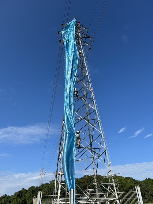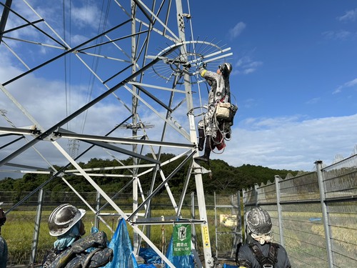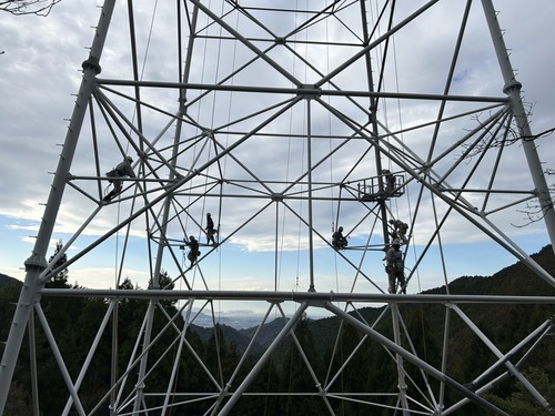 | 9:00 昇塔 | いよいよ作業の始まり。 安全装備を身に着けて、塔上作業員は自分の手と足だけで登っていきます。 |