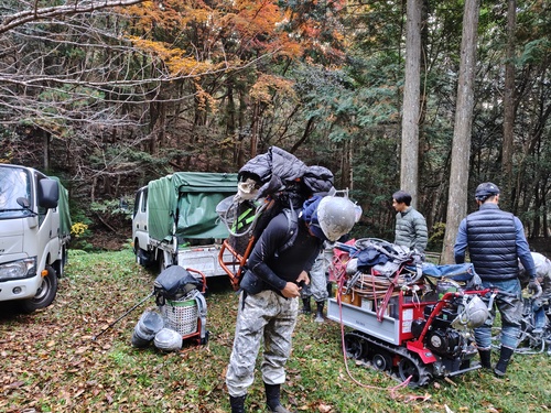 | 8:00 鉄塔へ向かう | 鉄塔敷地に車を入れます。 山地なら、車を止める場所から鉄塔まで少し歩きます。 運搬車に荷物を載せて出発! |
